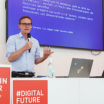 In der zweiten Keynote rückte Felix Nadolni die Frage in den Mittelpunkt, wie Vertrauen in KI-Systeme aufgebaut und erhalten werden kann. Er plädierte für einen bewussten und kontrollierten Einsatz: Statt möglichst viele Aufgaben auf einmal zu automatisieren, brauche es eine klare Aufgabenabgrenzung und die Fähigkeit, Systeme kritisch zu hinterfragen. „Integrität, Fähigkeit und Wohlwollen sind die Grundpfeiler für Vertrauen“, erklärte Nadolni, auch im Kontext der KI. Vertrauen könne nur entstehen, wenn die Systeme korrekt, nachvollziehbar und souverän arbeiten und die Verwaltungen wissen, was genau sie einsetzen. Dabei spiele insbesondere die Kompetenz der öffentlichen Hand eine entscheidende Rolle: Nur wer versteht, wie KI funktioniert und welche Grenzen sie hat, kann informierte Entscheidungen treffen. Der enge Austausch zwischen Domänenexpert*innen und KI-Spezialist*innen sei daher essenziell, sowohl in Behörden als auch in Unternehmen.